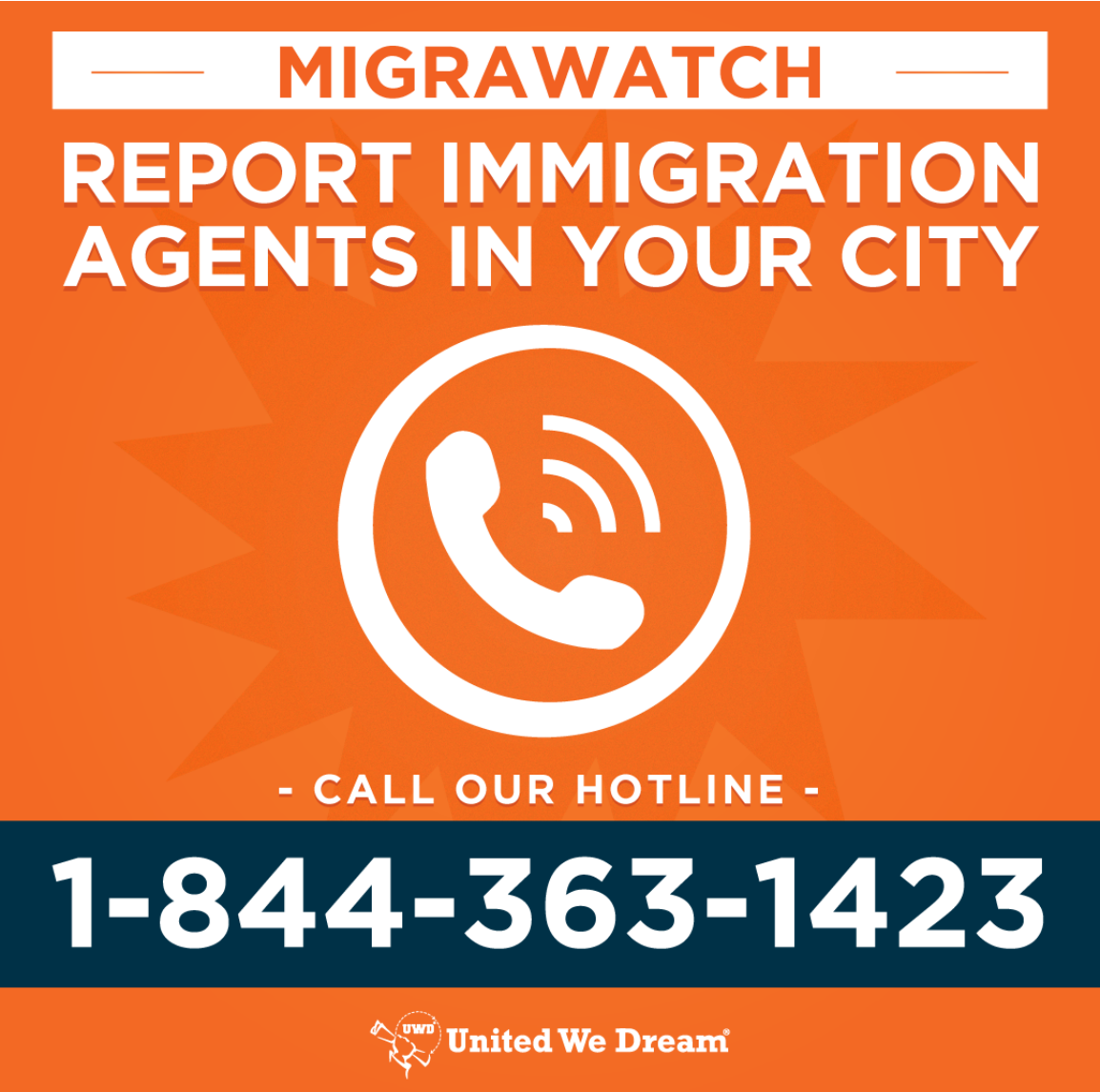Keep these information cards from United We Dream on hand, on your phone. I’ve asked them for printable versions (here’s a version I made, using the ACLU images as a source), for handing out and posting on bulletin boards. Keep the “MigraWatch” number on hand, too: